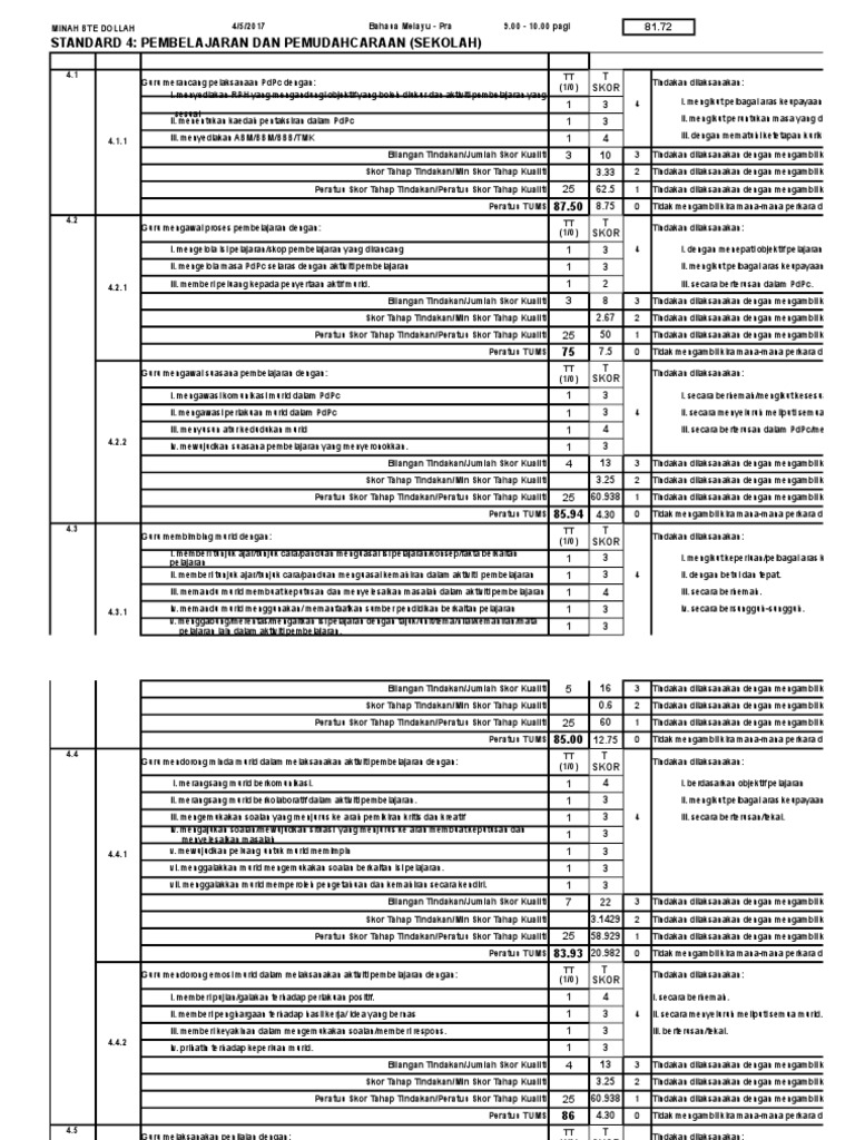 Borang Penskoran Standard 4 / K/p pengalaman mengajar kelas mata pelajaran dicerap m/pelajaran masa bil.
